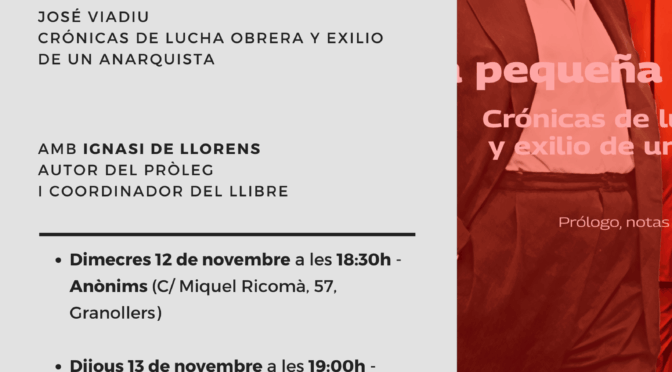 Aquest dimecres 12 de novembre el Centre d’Estudis Sindicals i Llibertaris, Anònims i la Fundación Anselmo Lorenzo ens conviden a la presentació del darrer llibre de l’escritor i historiador Ignasi de Llorens, sobre la vida de Josep Viadiu, “La pequeña historia”.