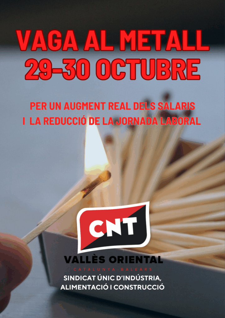 Des del SUIAC secundarà per aquests motius l’aturada del 29 i 30 d’octubre a les empreses on tenim implantació, i fem una crida a tots els treballadors i treballadores del metall del Vallès Oriental a afiliar-se a un sindicat veritablement independent, eficaç i solidari com és el Sindicat Únic d’Indústria, Alimentació i Construcció de la CNT.